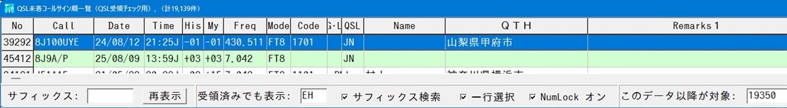 | 上図のようにQSL未着コール順一覧を表示させ、アクティブな状態(最前面に表示)にします。QSLカード受領チェックの状態です。 届いたQSLカードに右図のような#QRCode命令によるQRコードが印刷してある場合、QRコードリーダーを使って該当するQSOを表示させることができます。 このQRコードには、hQSL形式で交信情報が記載されていますので、QRコード内に書き込まれているコールサイン・年月日・時刻・バンドで照合して該当する交信の修正ウインドウを表示します。 交信時刻がUTCだった場合は、JSTに変換してQRコードに記録されている時刻と照合します。 交信時刻の誤差は、前後15分まで許容します。 照合NGだった場合は、QSL未着コール順一覧による手入力のQSL受領チェックとなり、コールサイン(サフィックス検索の場合はサフィックス)が近い局が選択されます。 QRコードリーダーを使ったQSL受領チェックの手順 ・QSL未着コール順一覧を表示させ、アクティブな状態(最前面に表示)にしておく。 ・QRコードリーダーでQSLカード上の赤い枠のあるQRコードを読み込む。 ・該当する交信の修正ウインドウを表示されたら、Insertキーを押して受領済みとする。この繰り返し。 カメラアプリを使ったQSL受領チェックの手順(Windows11付属のカメラアプリで動作確認済み) ・カメラにQRコードを読み込ませる。 ・カメラアプリ下部に読み込んだ文字列が表示されるので、クリックしてコピー。 ・QSL未着コール順一覧をアクティブな状態(最前面に表示)にする。 ・F4キーを押してクリップボードから照合。(F4キーは、メニューのQRコードから貼り付け照合のショートカットキー) ・該当する交信の修正ウインドウを表示されたら、Insertキーを押して受領済みとする。この繰り返し。 |