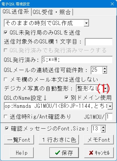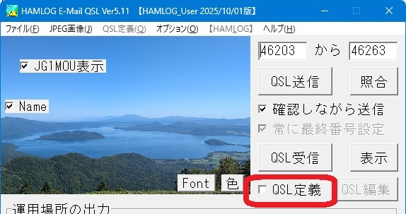 □JG1MOU表示(コールサイン描画) 送信するQSL上に自局コールサインを描画します。 コールサインは、通信設定のコールサインが適用されます。 マウスでドラッグして位置を調整することができます。 □Name 環境設定の送信系のQSLのName設定で指定した自局の オペレータ名やQTHなどを描画します。 マウスでドラッグして位置を調整することができます。 ・Fontボタン 自局コールサインの文字フォント、大きさ、色などを設定します。 フォントサイズは72まで選択できますが、直接数字を入れれば 細かく設定できます。フォントサイズ100なども可能です。 ・色ボタン □Nameの位置に表示されるオペレーター名の色を設定します。 サンプルボタンでイメージを確認してください。 |