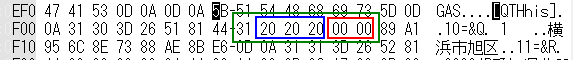 それが起きるのは、入力ウインドウのCode項目(市郡区町村)コードの入力時、2桁以下にすると、全6桁固定のうち、半角スペースで埋められるのが3バイトまでで、残りの1バイトもしくは2バイトが$00で埋められてしまうことによるものでした