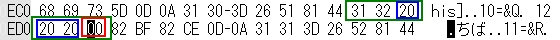 添付画像の例ように、全6桁のうち1桁めが1=$31、2から4桁目までの3バイトは$20で埋められますが、のこり2バイトが$00となってしまうというものです